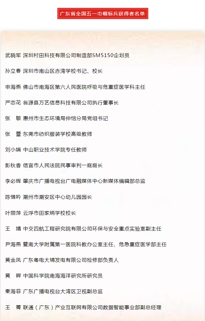 全国先进女职工集体和个人每两年评选表彰一次,该评选活动旨在大力弘扬劳模精神、劳动精神、工匠精神,鼓舞激励广大女职工在强国建设、民族复兴新征程上更好的发挥“半边天”作用。本次评选表彰中科院共3人、1集体荣获全国五一巾帼标兵、全国五一巾帼标兵岗称号。广东省共有17个集体和17名个人荣获全国五一巾帼标兵岗、全国五一巾帼标兵称号。