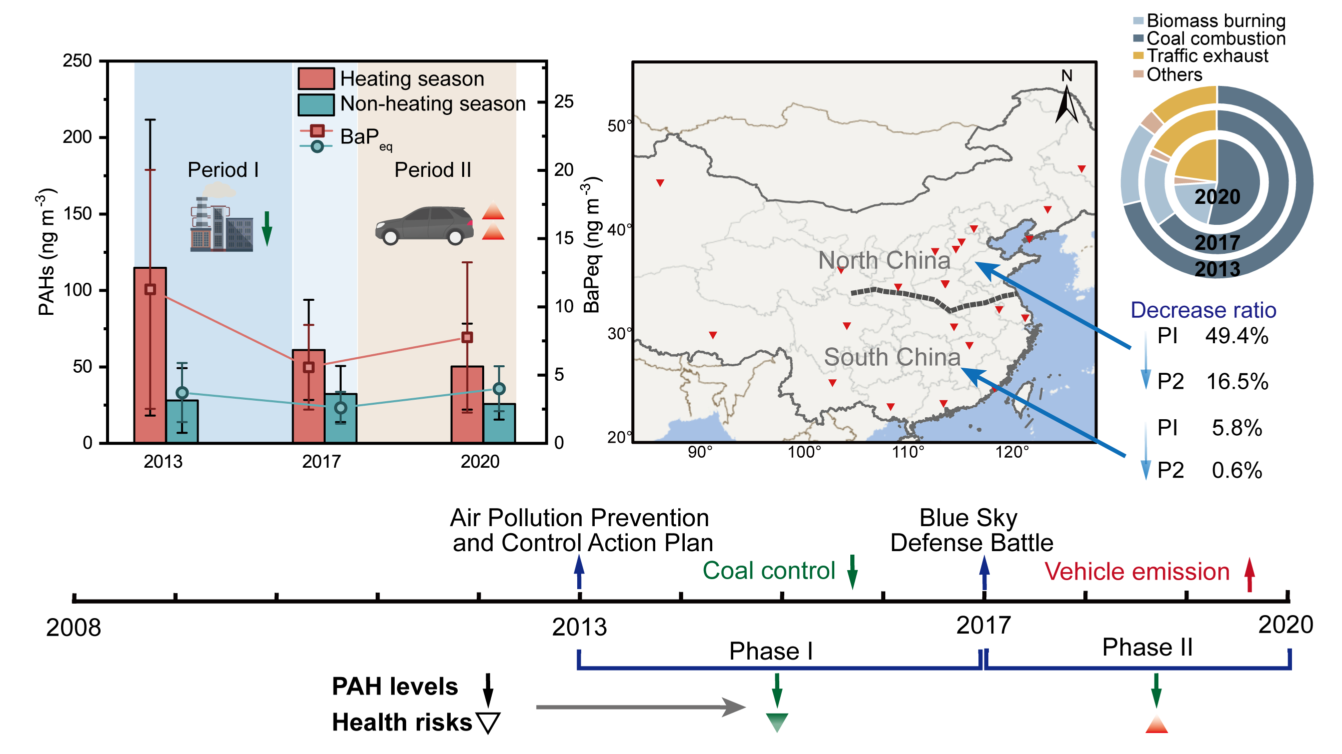 ????团队发现,我国清洁空气行动对PAHs污染的调控效果呈现出显著的阶段性差异(图2)。第一阶段(2013-2017年),依托末端治理措施(如工业提标、淘汰落后产能)与清洁供暖改造,北方地区PAHs浓度大幅下降49.4%,其中供暖季降幅达59.5%,主要缘于煤燃烧排放减少;第二阶段(2018-2020年),改善明显放缓,北方PAHs浓度仅小幅下降,南方基本持平,生物质燃烧排放保持稳定,而交通源贡献持续上升。