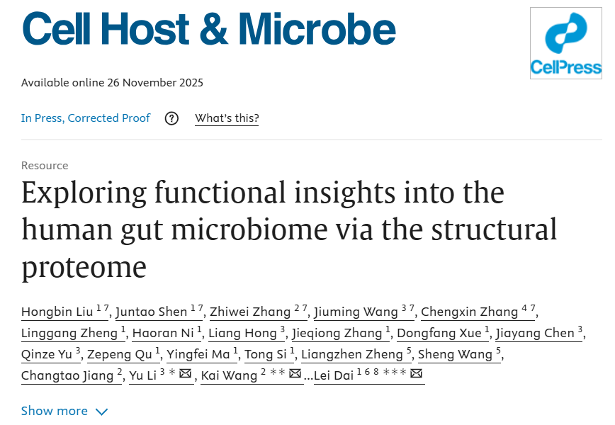2025年11月26日,中国科学院深圳先进技术研究院定量合成生物学全国重点实验室、合成生物学研究所(以下简称“深圳先进院合成所”)戴磊研究员课题组联合北京大学汪锴研究员、香港中文大学李煜教授的合作团队在Cell Host & Microbe发表了题为"Exploring Functional Insights into the Human Gut Microbiome via the Structural Proteome"的研究论文。该研究建立了人体肠道微生物的蛋白质结构组数据库和结构检索方法,显著提高了对噬菌体蛋白、菌源宿主同工酶等功能暗物质的预测能力大幅提高了噬菌体蛋白、菌源宿主同工酶的功能识别能力?;谡庖环椒?,研究团队成功验证了肠道致病菌的噬菌体裂解酶,并首次揭示了肠道细菌的褪黑素合成途径。