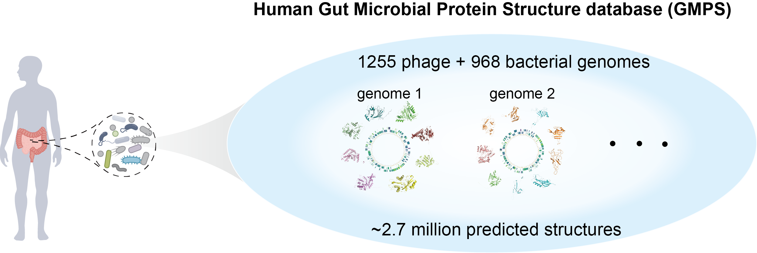 首先,研究团队构建了人体肠道微生物蛋白质结构组数据库 (human Gut Microbial Protein Structure database,https://www.gmpsdb.cn/)。该数据库涵盖968个肠道细菌和1255个肠道噬菌体基因组所编码的约270万个蛋白结构(图1)。