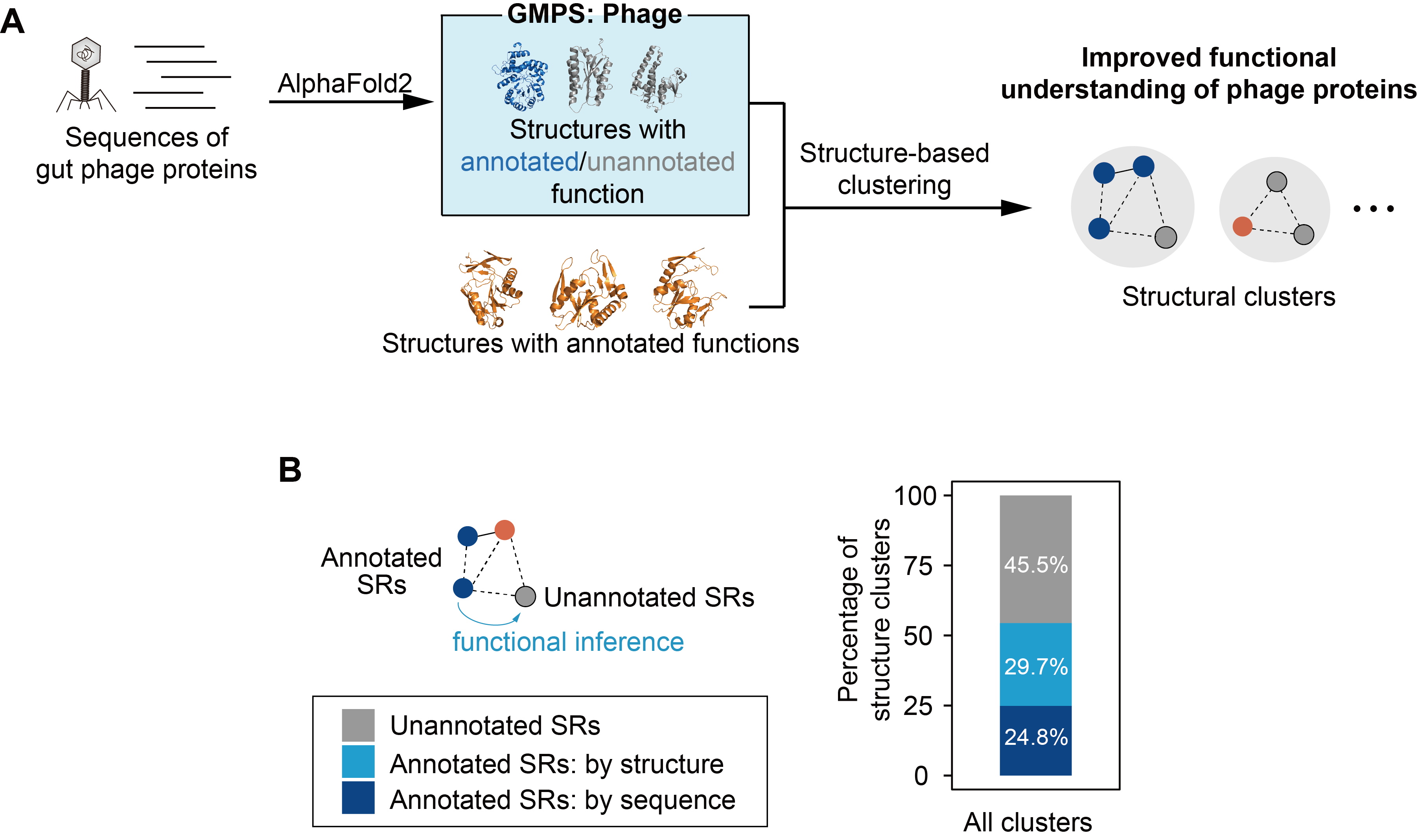 由于噬菌体基因组的快速进化,大部分噬菌体编码的蛋白难以通过序列比对进行注释。研究团队采用结构比对和聚类方法,研究噬菌体蛋白的功能注释和进化规律,发现许多噬菌体蛋白与已知功能蛋白之间存在结构相似度,可以大幅提高噬菌体蛋白的功能推断能力(图2)。