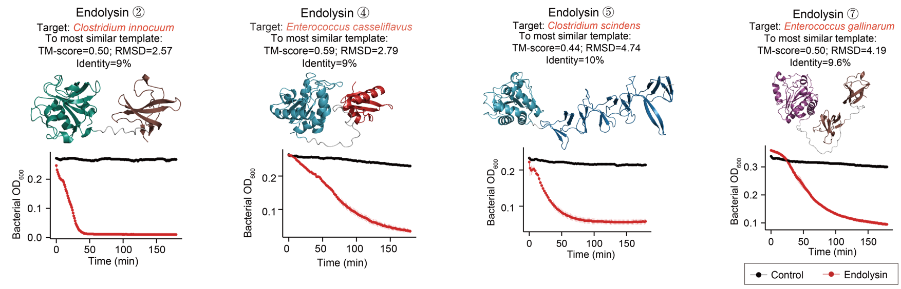 噬菌体裂解酶是一种噬菌体编码的溶菌酶,能够高效切割细菌细胞壁。通过系统分析噬菌体裂解酶的结构多样性,研究团队发现其存在结构域重排的进化机制。进而选取人体肠道致病菌噬菌体来源的裂解酶,通过合成生物学技术,成功验证了其针对人体肠道致病菌的裂解活性(图3)。此外,一部分噬菌体裂解酶具有很高的物种靶向性,有望成为微生物组精准编辑的平台技术。