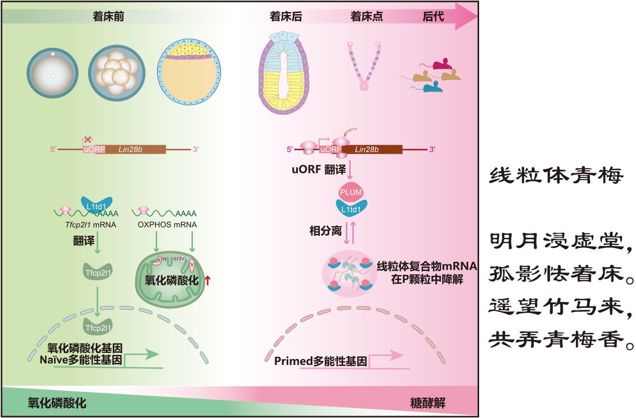团队利用核糖体测序技术发现在Primed多能干细胞中,Lin28b的5’UTR区特异性翻译产生微蛋白PLUM,且呈胞质点状聚集分布。通过构建基因敲除模型,研究证实PLUM缺失会使 Primed多能干细胞几乎以100%效率转变为Na?ve状态,并导致胚胎着床显著受损,表明PLUM 对多能干细胞命运具有决定性作用?;蒲芯勘砻鳎琍LUM与RNA结合蛋白L1td1直接互作,调控其胞质凝聚体和相分离,进而改变其结合的下游RNA,提高Tfcp2l1、Zfp42?等Na?ve多能性基因的RNA 稳定性提高,激活氧化磷酸化基因表达。同时,PLUM缺失也破坏了细胞中负责 mRNA 降解的P颗粒,其中富集编码线粒体复合物I和V的基因mRNA,提示PLUM可能通过P颗粒组装调控线粒体功能。