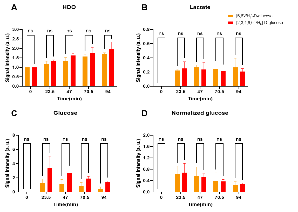 通过体尾静脉注射实验,研究团队还对[6,6′-2H?]-D-葡萄糖与[2,3,4,6,6′-2H?]-D-葡萄糖两种探针进行了对比。实验结果表明,[2,3,4,6,6′-2H?]-D-葡萄糖在维持原有代谢路径不变的基础下,提供了更高的葡萄糖信噪比,同时产生了更强的氘标记水检测信号。值得关注的是,该探针在合成成本方面相比传统探针降低了近一个数量级,这一重要突破为解决临床推广应用中的成本瓶颈问题提供了切实可行的方案。
