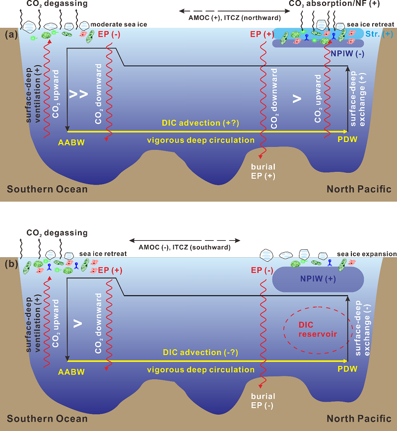图2 末次冰消期(a:暖期;b:冷期)南大洋和北太平洋热带-亚热带的物理-生物地化过程驱动的表层-深层碳循环过程