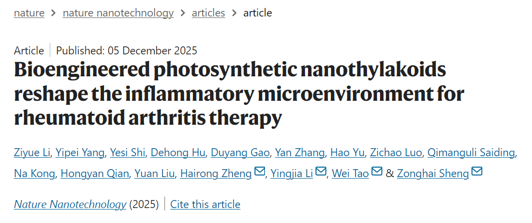 近日,中国科学院深圳先进技术研究院(以下简称“深圳先进院”)医学成像科学与技术系统全国重点实验室郑海荣院士、盛宗海研究员与哈佛医学院陶伟教授、南方医科大学李颖嘉教授等多家单位合作,研制出类囊体靶向新探针,创建植物光合作用重塑炎症微环境新技术,实现了炎症关键分子事件的精准成像与调控。相关成果以"Bioengineered photosynthetic nanothylakoids reshape the inflammatory microenvironment for rheumatoid arthritis therapy"为题发表在Nature Nanotechnology上。