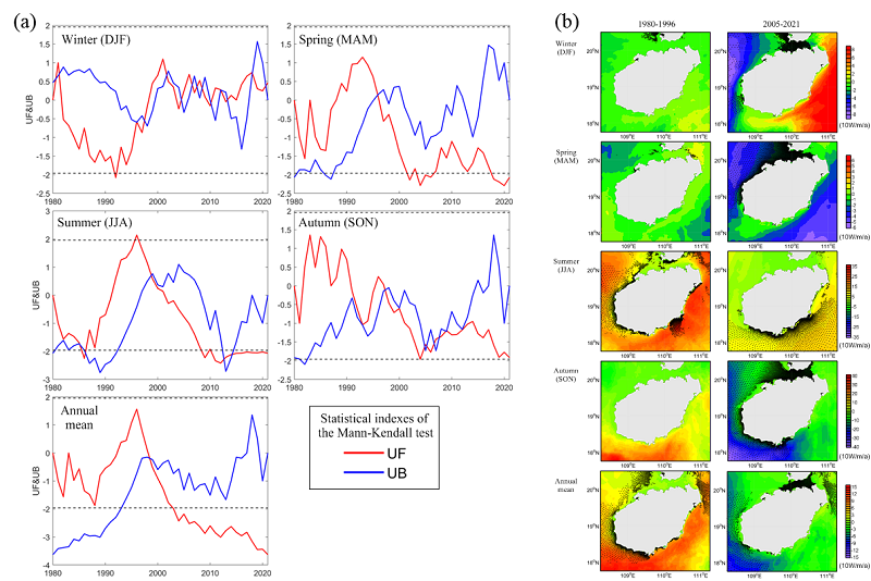 图1 基于长期高分辨率数值模式对海南岛波能资源(a)突变过程和(b)相应趋势变化的诊断结果(修改自Li et al.,2026)