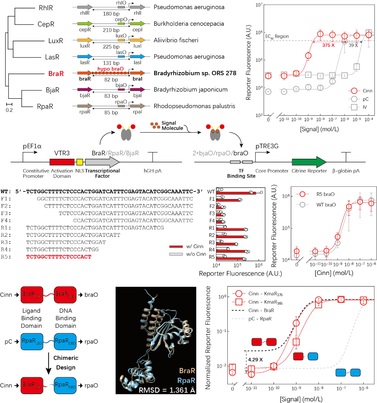 本研究首先构建并优化了Cinn接收???。实验结果显示,该模块的半最大效应浓度(EC50)低至约10-9 mol/L,其灵敏度比现有报道的最优哺乳动物细胞通讯信号系统提升了约375倍。为了进一步提升性能,研究团队界定了BraR的最小核心结合序列,将其从46 bp精简至18 bp,有效降低了潜在的非特异性结合风险。此外,针对受体本底泄漏较高的问题,团队利用AlphaFold2进行结构预测,采用嵌合工程策略将BraR的配体结合域(LBD)与同源蛋白RpaR的DNA结合域(DBD)融合,成功开发出新型受体KmaR。该受体在保持超高灵敏度的同时显著抑制了本底活性,实现了信号识别精度与动态响应范围的协同优化。
