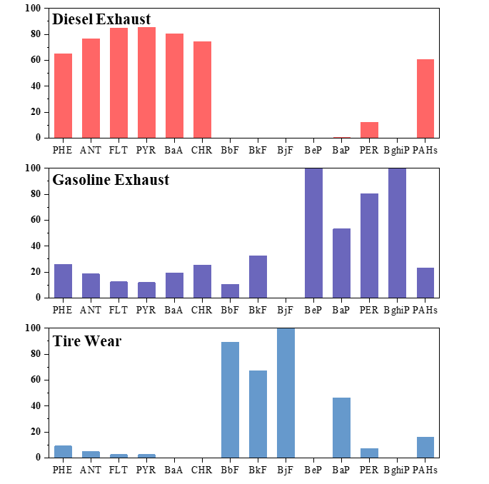 图1:PMF模型解析出的三种PAHs排放源(柴油车排放、汽油车排放、轮胎磨损)的成分谱。