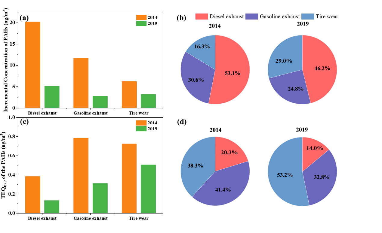 图2:2014年与2019年各排放源对PAHs质量浓度及致癌毒性(以苯并[a]芘毒性当量TEQ计)贡献的对比。