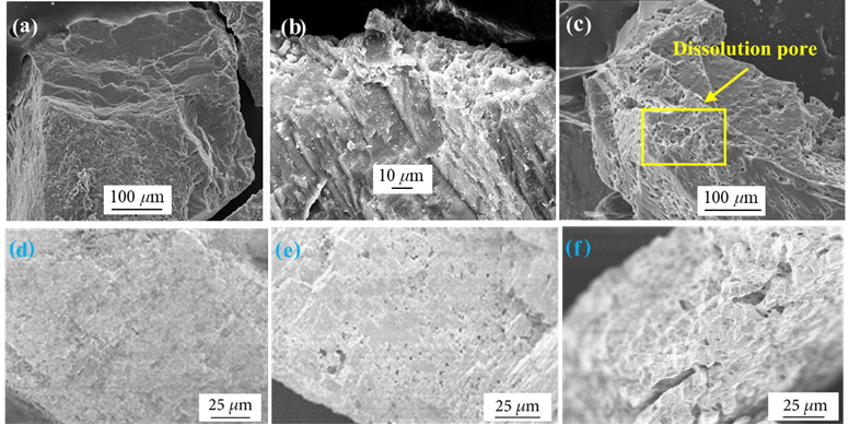 图3 扫描电镜(SEM)记录实验模拟乙酸溶蚀长石(a-c)和白云岩(d-f)的溶蚀过程。(a)溶蚀前长石形态;(b)长石显被乙酸后局部形成溶蚀坑;(c)长石被严重溶蚀后形成大量溶蚀孔洞;(d)溶蚀前白云石形态;(e)白云石在75℃条件下被乙酸溶蚀形成的溶蚀坑;(f)白云石在200℃时条件下被乙酸溶蚀后形成的蜂窝状孔隙。