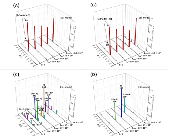 图2 (A)石竹烯和(B) α-蒎烯生成的α-HH暴露于相同浓度,不同种类有机胺以及氨气的信号强度,(C)和(D)中展示了对应生成物