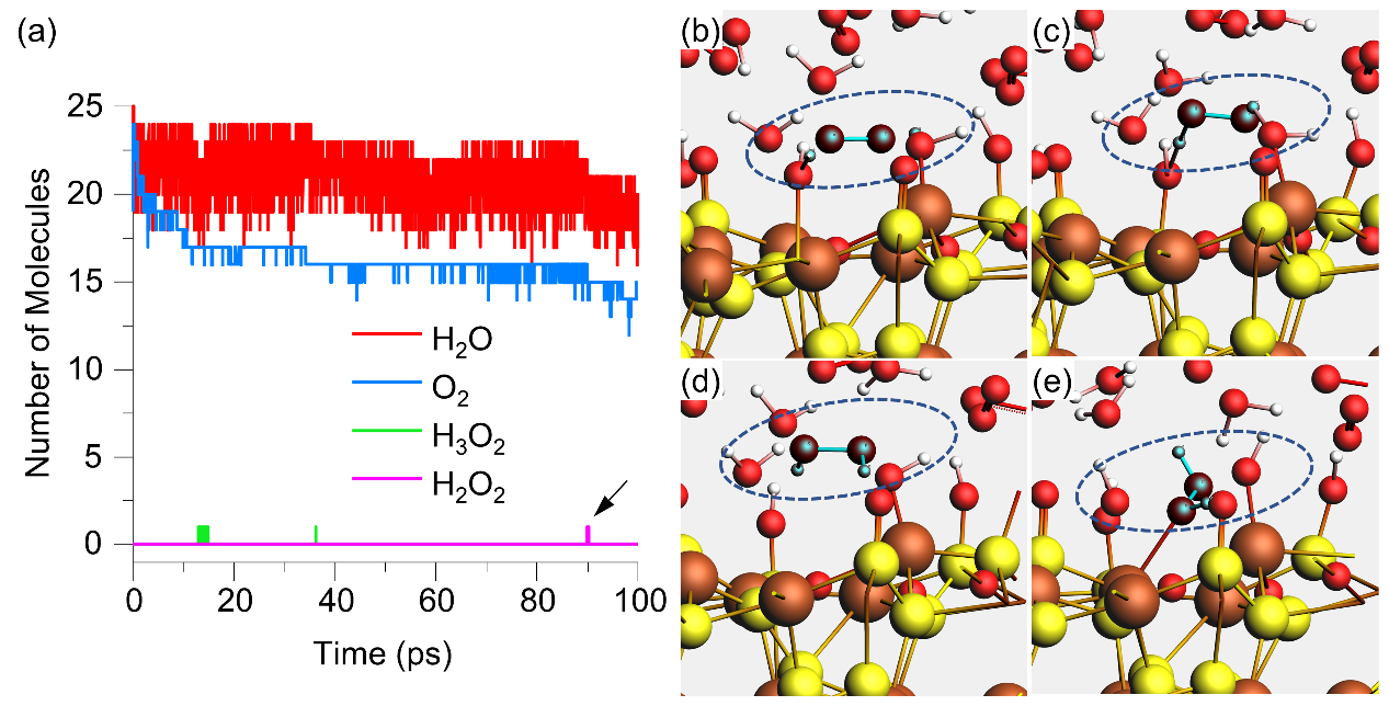 图 2. 黄铁矿{100}-V5表面被O2和H2O氧化100 ps期间的分子数变化(a);O2和H2O氧化黄铁矿{100}-V5晶面过程中形成H2O2的反应途径(b-e);蓝色高光的分子代表反应途径的示踪剂?;粕?、棕色、红色和白色球分别代表S、Fe、O和H