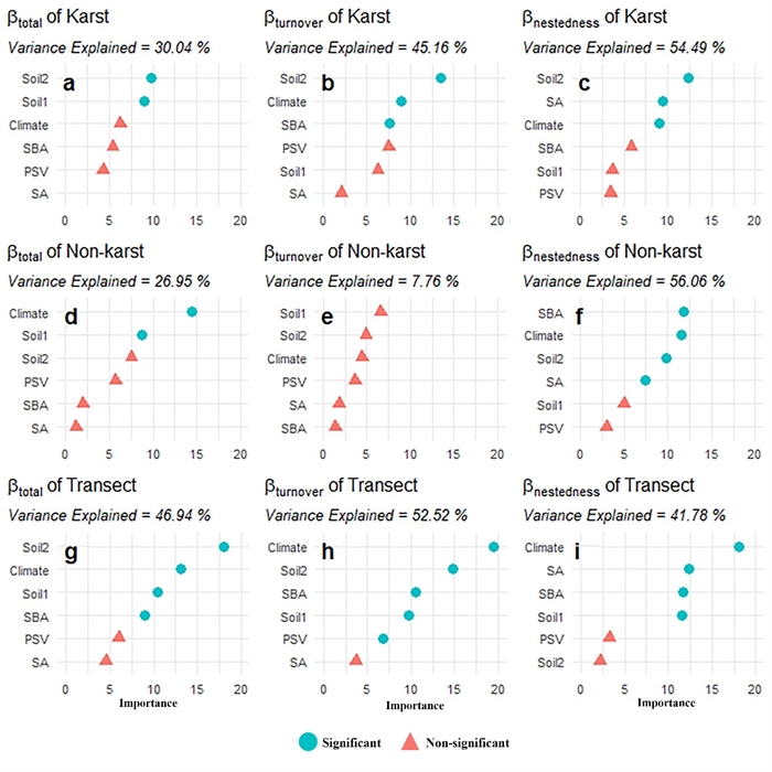 研究表明,喀斯特与非喀斯特森林在物种组成上存在显著差异。当将两类森林同时纳入分析时,整条样带的βtotal和βturnover显著高于任何单一岩性森林,而βnestedness则显著降低,表明岩性差异显著增强了群落间的物种组成异质性。研究还表明,西南喀斯特地区β多样性的纬度格局并非由单一过程驱动,而是喀斯特与非喀斯特两个森林子系统动态叠加的结果。整条样带的βtotal和βturnover随纬度升高而显著下降,这一趋势主要由喀斯特森林所主导,并与岩溶作用密切相关的土壤理化性质异质性变化密切相关。相比之下,βnestedness随纬度升高显著增加,则主要反映了非喀斯特森林中由气候因子增强所引起的环境筛选作用,表明不同岩性森林对纬度变化的响应机制存在明显差异。总的来说,这项工作从地质-土壤-植物耦合视角揭示了地质背景在塑造大尺度植物多样性空间格局中的关键作用,不仅拓展了对β多样性维持机制的理解,也为区域植物多样性?;ぬ峁┝诵滤悸?。?