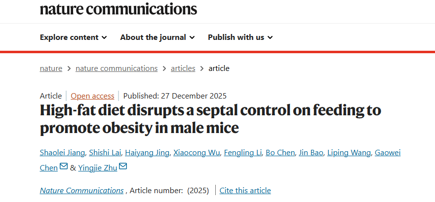 肥胖本身会不会影响这个“刹车系统”的功能?它又如何反过来影响肥胖的发展?12月27日,中国科学院深圳先进技术研究院脑认知与脑疾病研究所/深港脑科学创新研究院朱英杰团队于Nature Communications上发表最新研究,通过单细胞测序、电生理记录、钙成像等技术,揭示了高脂饮食通过削弱外侧隔核的“刹车”功能,导致进食失控,从而推动肥胖进程。