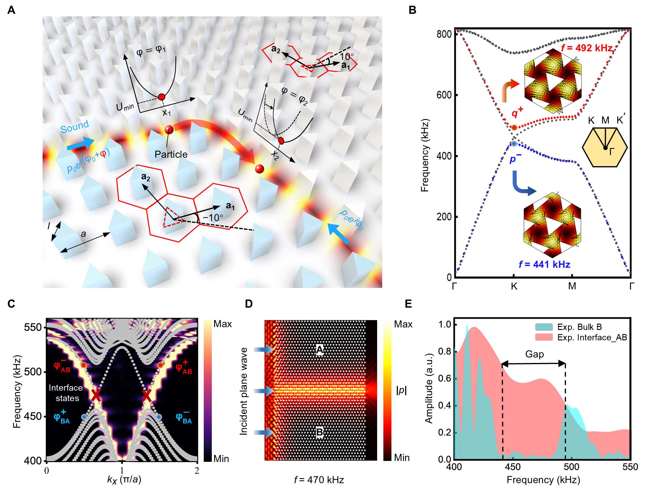 图1:?拓扑声学质量输运。(A)?利用谷霍尔拓扑绝缘体实现颗粒输运示意图。(B)?元胞能带结构。插图为两种谷态(q?和p?)的模拟本征场分布。(C)?超胞能带结构及通过傅里叶变换得到的相应频谱。(D)?在470 kHz频率下,谷霍尔拓扑绝缘体中的仿真声压场分布,平面波从左边界入射。(E)?晶格B和晶格A-B界面的实验测量透射谱。在带隙范围内(如黑色虚线标注)可观察到明显的拓扑波传输。