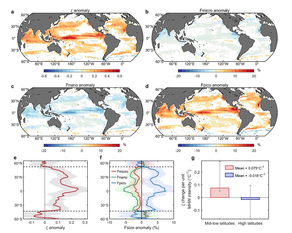 图1?全球海洋热浪期间浮游植物粒径结构变化分布。(a) 1998-2022年热浪期间浮游植物粒径结构斜率(ξ)异常值的空间分布,仅显示过显著性检验的区域(t检验,p=0.05)。(b-d) 同 (a),分别对应Fmicro、Fnano和Fpico的变化。Fmicro、Fnano和Fpico分别表示小型浮游植物、微型浮游植物和微微型浮游植物对总浮游植物碳含量的贡献比例。(e)ξ与(f)不同粒径级浮游植物优势度在热浪期间的纬向平均异常值。阴影区域表示各纬度经向方向上的一个标准差范围。(g) 中低纬度与高纬度海域,单位热浪强度对应的ξ平均变化量。