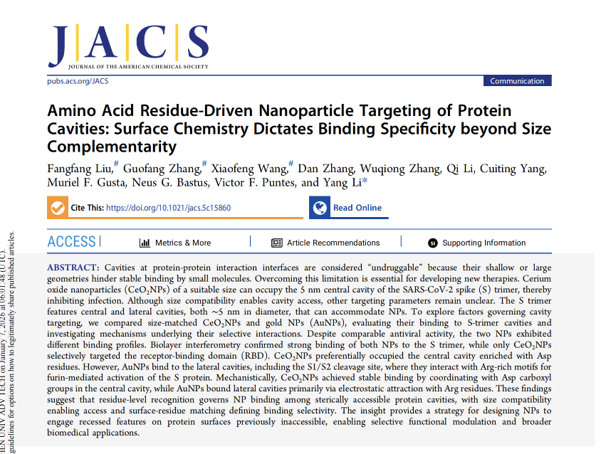 蛋白-蛋白相互作用界面的蛋白表面腔体在细胞信号调控和病毒入侵等过程中具有重要功能,但其结构浅、尺度较大,长期被认为难以通过传统小分子实现稳定靶向,成为限制相关调控策略发展的重要瓶颈。团队此前研究(Nano Today, 2024, 55, 102183)发现,尺寸约为 3 nm 的氧化铈纳米颗粒(CeO?NPs)能够插入 SARS-CoV-2 刺突蛋白约 5 nm 的中央腔体,为“纳米材料可靶向蛋白表面腔体”这一概念提供了直接实验依据。在此基础上,团队进一步开展了针对腔体选择性靶向机制的系统研究。