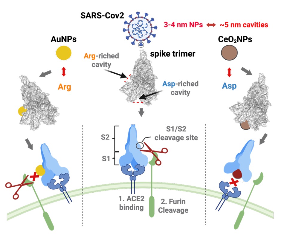 本研究以 SARS-CoV-2 刺突蛋白(Spike,S 蛋白)为模型体系,选取尺寸高度一致但表面化学性质不同的CeO?NPs和金纳米颗粒(AuNPs),在严格控制尺寸变量的前提下,系统比较了纳米材料表面化学性质对蛋白腔体靶向行为的影响。结果显示,两类纳米颗粒均可通过与刺突蛋白结合发挥抗病毒作用,但其结合位点和分子机制存在显著差异。CeO?NPs倾向于靶向富含天冬氨酸(Asp)残基的中央腔体,通过与 Asp 羧基之间的配位作用实现稳定结合,从而阻断S蛋白与宿主细胞ACE2受体的识别过程。而AuNPs主要结合富含精氨酸(Arg)残基的侧向腔体,依赖与Arg的静电作用和氢键相互作用,靠近S1/S2 酶切位点区域,干扰宿主蛋白酶介导的刺突蛋白激活过程。