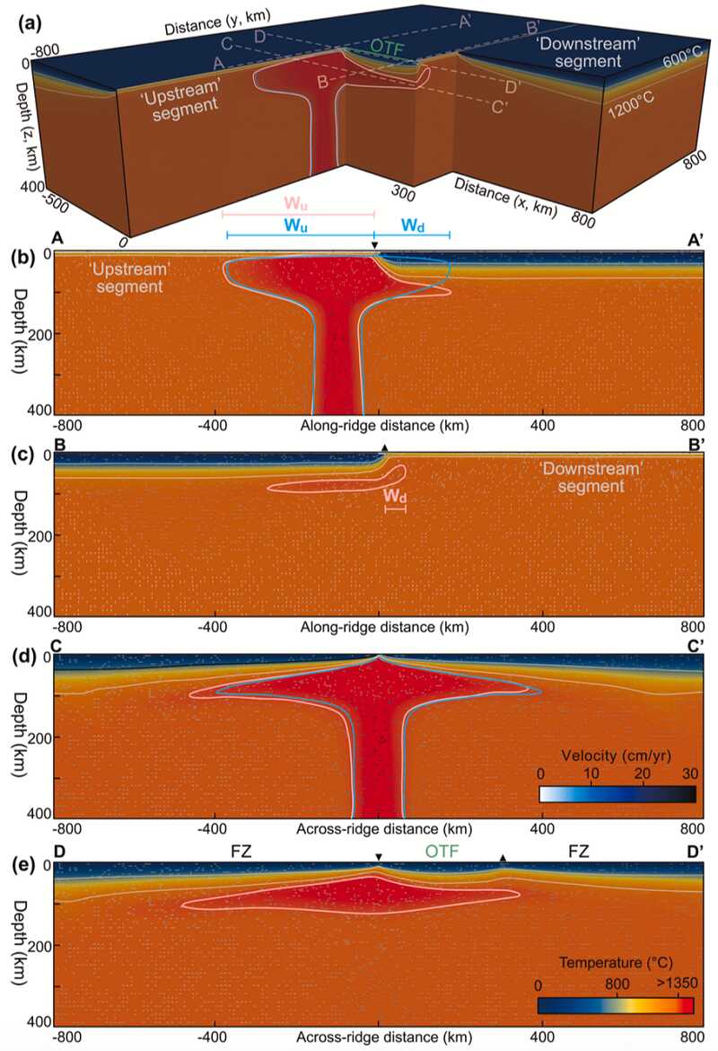 针对该科学问题,研究团队对全球 24 个地幔柱–洋中脊–转换断层系统的构造特征进行量化分类,提取地幔柱至洋中脊及转换断层的距离、断层长度等几何参数;随后三维地球动力学模拟程序,在不可压缩质量–动量–能量守恒框架下引入地幔柱成分场,追踪其物质与热扩散,开展高分辨率三维数值模拟。