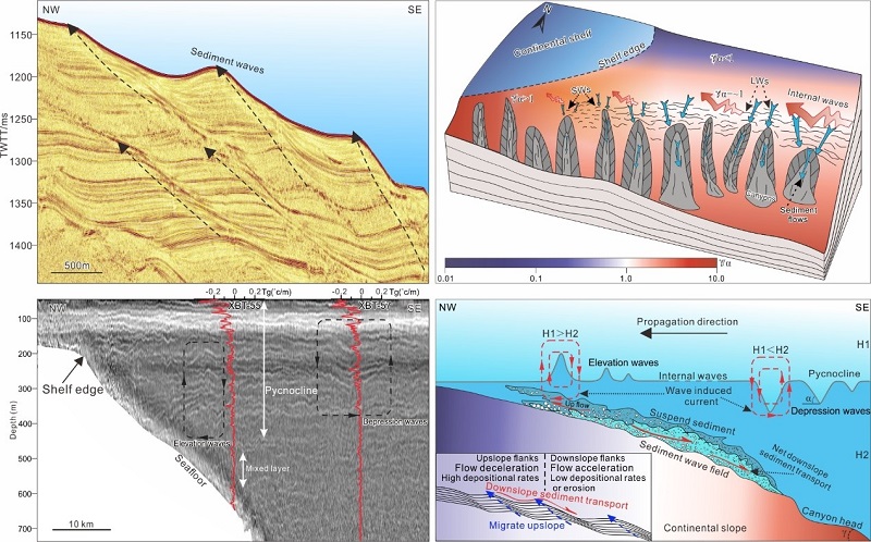 团队聚焦珠江口盆地神狐峡谷群头部区域,整合了该区域高分辨率二维/三维地震数据、沉积物重力样与长期水文观测,系统阐明了内波在该区域大规模沉积物波形成中的主导作用。研究证实,在海底坡度(γ)与内波群速度向量角(α)的比值趋近于1的“临界区域”,内波能量发生显著耗散并强烈扰动海底边界层,为细粒沉积物的持续再悬浮与输运提供了关键动力。这种独特的海洋动力过程使得海底沉积物不断重新分布,最终塑造出波高可达50米、波长达1.4公里的巨型起伏地貌。