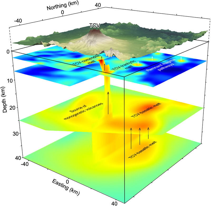 研究团队基于长白山火山区的78个大地电磁台站数据,构建了高分辨率的三维电阻率模型,在天池火山下方识别出从浅地表至上地幔垂向连续分布的低阻异常,反映了完整的跨地壳岩浆系统。该系统包含三个明显分层又相互连通的岩浆储库:(1)下地壳玄武质岩浆储库(20-35km深),估算熔融分数2.1-3.7%,体积约19,500 km3,构成深部地壳热区主体;(2)上地壳粗面质岩浆储库(5-10km深),估算熔融分数7.0-16.3%,体积约95 km3,顶部地震频发,可能与岩浆驱动破裂有关;(3)浅部碱流质岩浆储库(2-3.5 km深),估算熔融分数18.8-23.8%,体积约36 km3,与长白山“千年大喷发”岩浆房位置吻合。