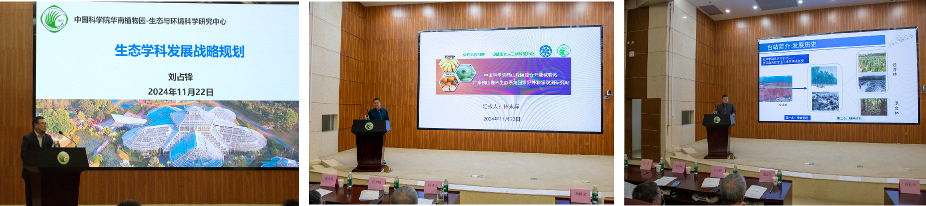 会议由闫俊华副主任主持。张苏峻在致辞中指出,广东鹤山森林生态系统国家野外科学观测研究站(以下简称“鹤山站”)、中国科学院小良热带海岸带生态系统定位研究站(以下简称“小良站”)等试验站,在广东省森林生态系统联网观测等方面发挥了宝贵的示范作用和重要的支撑作用,为恢复生态学的发展、森林生态系统研究、林下经济发展作出了重要贡献,希望华南植物园再接再厉,再创佳绩,助力绿美广东生态建设,共筑南粤美好生态家园。随后,张佳宝院士、刘世荣院士和华南植物园主任任海分别作了题为“耕地土壤--生物多样性及其生物网络赋能生产力等功能探索”“中国造林绿化和生态系统修复的经验与启示”和“热带珊瑚岛的植被生态系统构建”的主旨报告?;现参镌吧牖肪晨蒲а芯恐行闹魅瘟跽挤嫜芯吭弊髁松Э品⒄拐铰怨婊ǜ?,从发展历史、组织架构、亮点成果、未来规划等方面对我园生态学研究进行了系统梳理与分析。鹤山站副站长林永标和小良站站长王法明分别作野外台站发展规划汇报,回顾了鹤山站40年来的发展历程,梳理恢复生态学研究与实践对广东林业及绿美广东生态建设的引领和支撑以及未来发展规划。