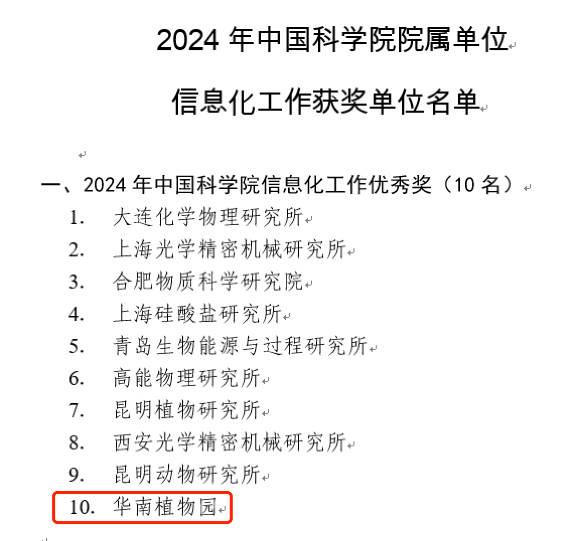 为推动院属单位的信息化建设和应用工作,提升全院信息化水平,中国科学院组织开展了2024年全院信息化评估工作。此次评估,中国科学院华南植物园被评为A类研究所,荣获2024年中国科学院院属单位信息化工作优秀单位(排名第10)。