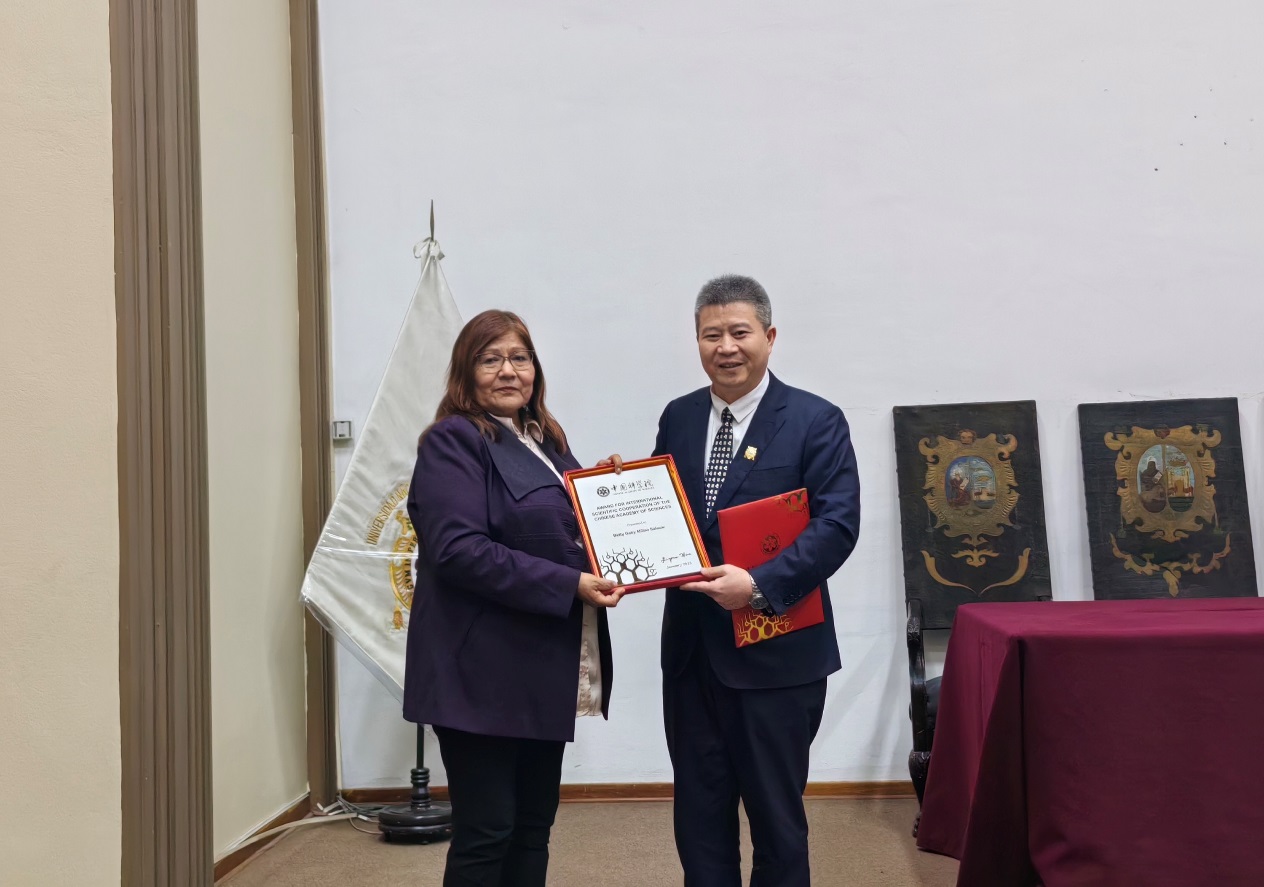 秘鲁国立圣马科斯大学校长Jeri Gloria Ramón Ruffner De Vega女士热情接待了华南植物园代表团一行?;崽钢?,Jeri校长表示华南植物园此次访问将开启双方新的合作篇章。闫俊华对Jeri校长的邀请表示感谢,并回顾了华南植物园与秘鲁圣马科斯大学在过去十几年合作所取得的成绩。他表示,秘鲁和中国都是全球生物多样性热点区域国家,秘鲁也是全球农作物起源中心之一,非常期待双方未来在生物多样性?;?、生物资源利用等多方面开展国际合作。闫俊华还代表中国科学院为圣马科斯大学Betty Millan 教授颁发了2023年度中国科学院国际合作奖,对Betty Millan女士对中国与秘鲁科技合作与交流所做的贡献给予了充分的肯定与感谢。