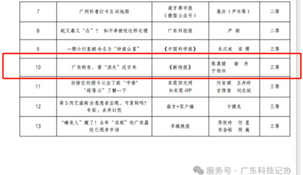 近日,由广东科技新闻工作者协会主办的第二十七届广东科技好新闻奖、第八届广东省科普好新闻奖获奖作品揭晓。此次评选经过专家网上初评、会议终评,并在广东科技记协微信公众号公示,评选出“第七届广东省科普好新闻奖”共13项。其中,华南国家植物园珍稀濒危植物保育的报道《广东特有,曾“消失”近百年》(作者:陈慕媛(新快报)、谢丹、宁祖林)荣获广东省科普好新闻奖三等奖。