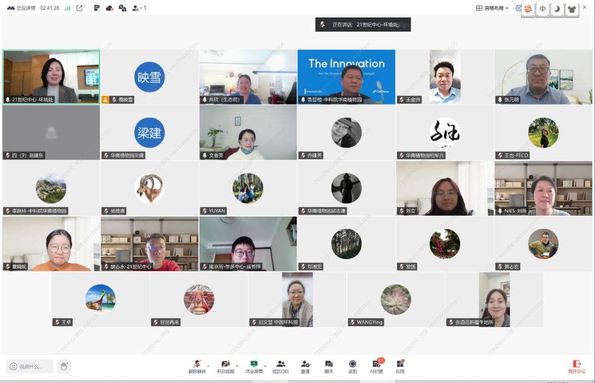 中国21世纪议程管理中心生态环境处刘荣霞副处长主持本次会议?;嵋榈玫搅松肪巢可镜拇罅χС郑憔哿死醋陨肪巢?、中国科学院、中国环境科学研究院等机构与科研单位的三十余位领导与专家学者,围绕生物多样性?;び牖指吹谋曜蓟?、国际化、实施路径以及昆蒙框架履约等开展深度交流。